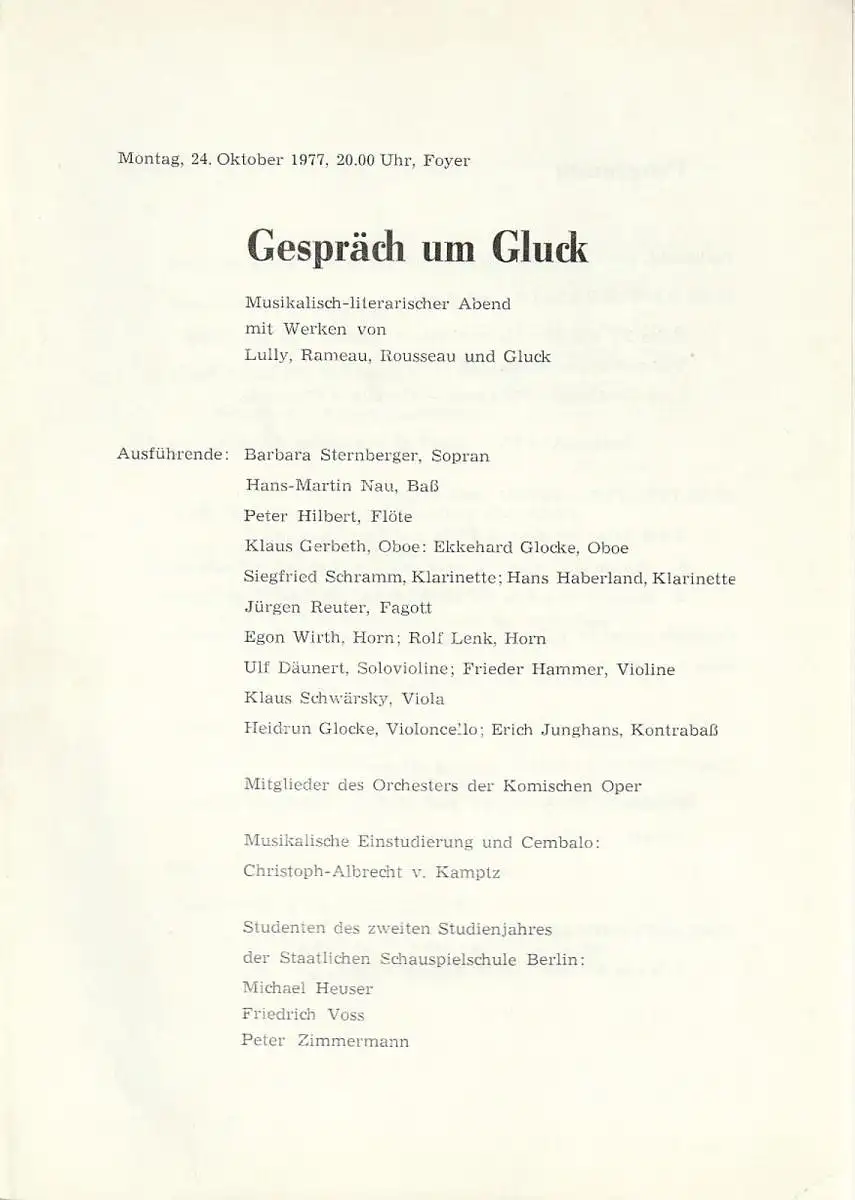 Musikalisch-literarischer Abend mit Werken von Lully, Rameau, Rousseau und Gluck. Ausführende: Barbara Sternberger, Sopran / Hans-Martin Nau, Baß / Peter Hilbert, Flöte / Klaus Gerbeth, Ekkehard Glocke, Oboe, Siegfried Schramm, Hans Haberland, Klarinette, Jürgen Reuter, Fagott / Egon Wirth, Rolf Lenk, Horn / Ulf Däunert, Soloviolone / Frieder Hammer, Violine / Klaus Schwärzky, Viola / Heidrun Glocke, Violoncello / Erich Junghans, Kontrabaß. Mitglieder des Orchesters der Komischen Oper. Musikalische Einstudierung und Cembalo: Christoph-Albrecht von Kamptz. Studenten des zweiten Studienjahres der Staatlichen Schauspielschule Berlin: Michel Heuser, Friedrich Voss, Peter Zimmermann. Programm: JEAN BAPTISTE LULLY: Suite Nr. 3 B-Dur für zwei Oboen, Fagott, Violinen, Viola, Violoncello und Kontrabaß. Arie aus der Oper Cadmus et Hermione. JEAN PHILIPPE Rameau: Zwei Arien für Sopran, Flöte und Basso continuo. CHRISTOPH WILLIBALD GLUCK: Triosonate III, A-Dur für zwei Violinen und Basso continuo. Kantate Die Klagen der Liebe für Sopran, zwei Violinen, Viola, Violoncello, Kontrabaß. Sinfonie G-Dur für Streicher und zwei Hörner. JEAN JACQUE ROUSSEAU: Quatre Aits a deux Clarinettes - Theaterprogramm, Opernprogramm, Ballettprogramm, Musicalprogramm, Konzertprogramm, Theatermemorabilia, Programmhefte Sammlung, deutsche Theatergeschichte.