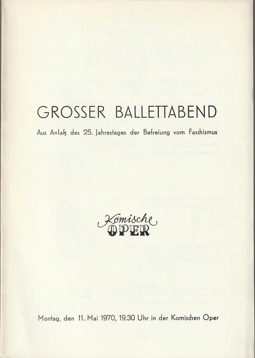 Mitwirkende: Staatliche Ballettschule Berlin: Mitwirkende: Schüler und Studenten der Ballettschule. Choreographie: Ursula Berndt. Metropol-Theater: Helga Dürr, Hildegard Hoffmann, Karin Münch, Maria Sierakowski, Rainer Busch, u. a. Choreographie: Helga Wasmer-Witt. Friedrichstadt-Palast: Mitwirkende: Elke Rieckhoff, Eva Schirmer, Dieter Benedix, Peter Erdmann, Rolf Pfannenstein, u. a. Choreographie: Gisela Walther. Erich-Weinert-Ensemble der NVA: Mitwirkende: Inge Bonse, Petra Büttner, Rita Langfeld, Gerhard Adamski. Karl-Heinz Roth, u. a. Choreographie: Jochen Winkler. Staatliches Tanzensemble der DDR: Mara Boßmann, Uta Buley, Heide Elze, Monika Erhardt, Hannelore Meinert, u. a. Choreographie: Thea Maaß. Deutsche Staatsoper: Mitwirkende: Nora Monk, Claus Schulz und Frank Bade, Jürgen Dahms, Bernd Dreyer, u. a. Choreographie: Grita Krätke, Claus Schulz. Komische Oper: Mitwirkende: Hannelore Bey, Roland Gawlik und Ute Bürger, Ute Mitreuter, Maria Pachmann, Sighilt Pahl, u. a. Choreographie: Tom Schilling, Jean Weidt. Gruppe junger Tänzer: Laientanzensemble der Komischen Oper. Programm: Erstaufführungen: SIEGFRIED MATTHUS: Match. GERHARD ROSENFELD: Wart auf mich, ich kehr zurück. MIKES THEODORAKIS: Abschied. HANS BERT POULHEIM: Aus dem Vietnam - Zyklus. Des weiteren Werke von August Conrai, Gerhard Honig, Klaus-Peter Bruchmann, Kurt Greiner-Pol, Gottfried Riedel und Boris Assafjew. - Schlüsselwörter: Theaterprogramm, Opernprogramm, Ballettprogramm, Musicalprogramm, Konzertprogramm, Theatermemorabilia, Programmhefte Sammlung, deutsche Theatergeschichte.
