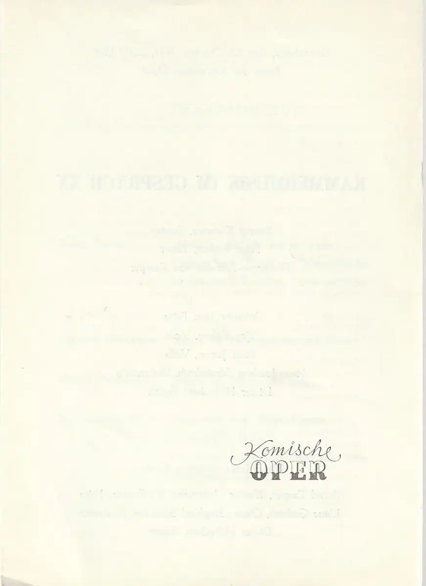 Renate Krahmer, Sopran / Peter Seufert, Tenor / Christoph-Albecht von Kamptz. Werner Tast, Flöte / Jörg Kühne, Peter Joram, Viola / Hans-Joachim Scheitzbach, Violoncello / Dieter Hänchen, Fagott. Die Bläservereinigung Berlin: Bernd Casper, Klavier / Hermann Wolfframm, Flöte / Klaus Gerbeth, Oboe / Siegfried Schramm, Klarinette / Dieter Hänchen, Fagott. Programm: RAINER KUNAD: Melodie, die ich verloren hatte. Gesänge nach Versen von Günter Deicke für Sopran, 2 Bratschen, 2 Celli und Flöte. FRIEDRICH GOLDMANN: Sonate für Bläserquintett und Klavier. KRISTOF PENDERECKI: Sonate für Solo-Cello. TILO MÜLLER-MEDEK: Fragmente einer Kleist Hymne ( Johannes R. Becher ) für Bläser Quintett, Klavier und hohe Singstimme - Theaterprogramm, Opernprogramm, Ballettprogramm, Musicalprogramm, Konzertprogramm, Theatermemorabilia, Programmhefte Sammlung, deutsche Theatergeschichte.