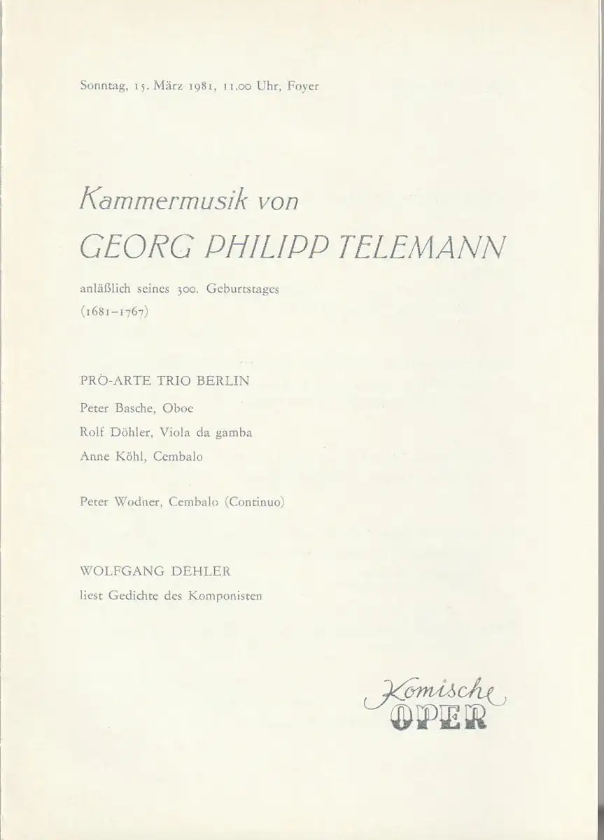 Komische Oper Berlin: Programmheft KAMMERMUSIK VON GEORG PHILIPP TELEMANN 15. März 1981 Foyer Komische Oper Spielzeit 1980 / 81.