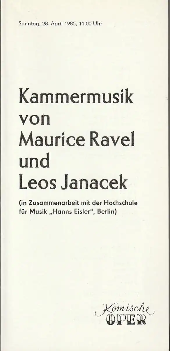 Komische Oper Berlin: Programmheft KAMMERMUSIK VON MAURICE RAVEL UND LEOS JANACEK 28. April 1985 Spielzeit 1984 / 85.
