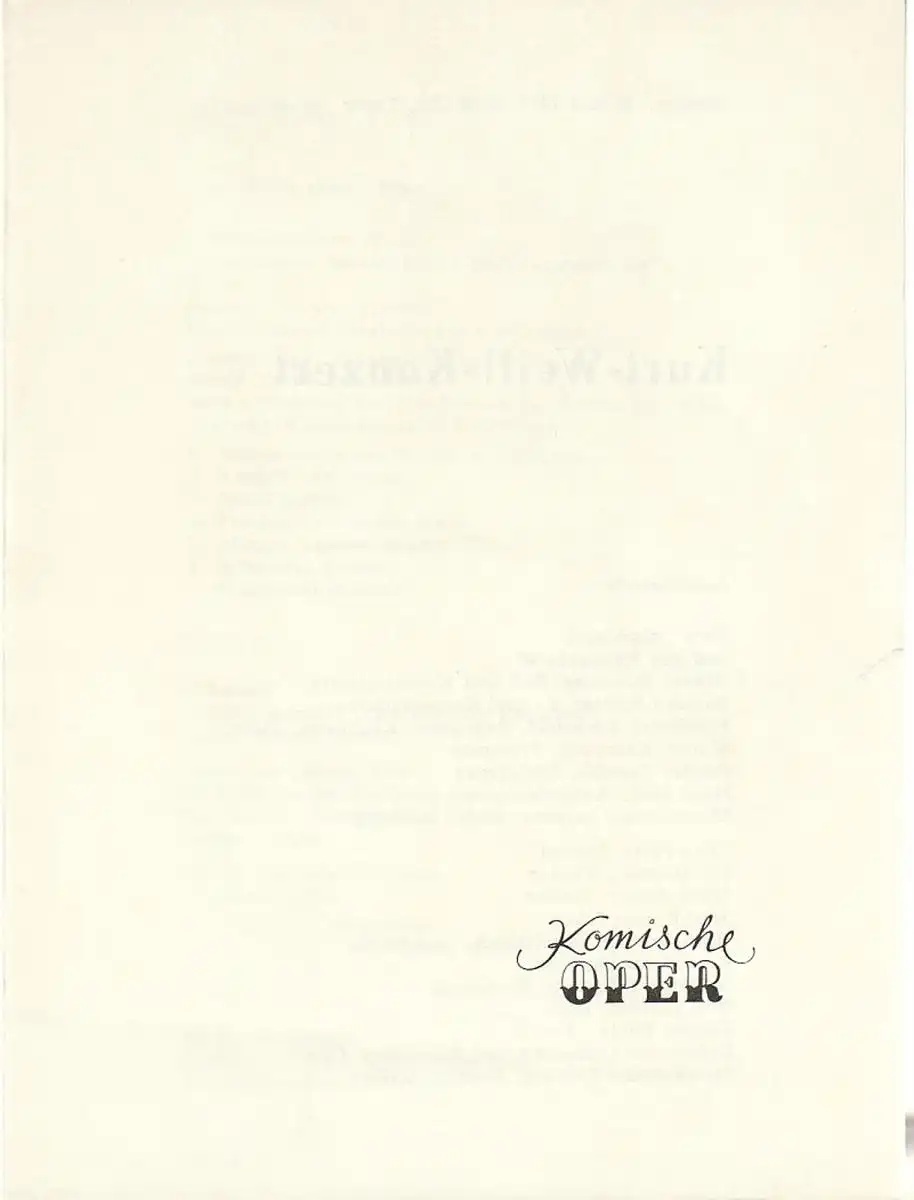 Vera Oelschlegel und Ensemble 66: Dieter Rumstieg, Baß- und Konzertgitarre / Barbara Richter, E. - und Konzertgitarre / Friedhelm Schönfeld, Saxophon, Klarinette, Flöte / Walter Kauerauf, Trompete / Günter Ospalek, Schlagzeug/ Hans Boll, Akkordeon. Musikalische Leitung: Dieter Rumstig. Thea Peter, Sopran / Ulf Däunert, Violine / Horst Meyer, Violine / Jörg Kühne, Viola / Hans-Joachim Scheitzbach, Violoncello / Kurt Sümnich, Flöte / Siegfreis´d Schramm, Klarinette / Rolf Ludwig, Hprn / Jürgen Reuter, Fagott. Bläser des Orchester der Komischen Oper. Musikalische Leitung: Joachim Willert. Programm: KURT WEILL: Streichquartett op. 8. Liederzyklus Frauentanz op. 10. Sieben Gedichte des Mittelalters für Sopran mit Flöte, Bratsche, Klarinette, Horn und Fagott. Materl aus der Kantate Das Berliner Requiem ( Text Bertolt Brecht). Songs aus Happy End. Kleine Dreigroschenmusik für Blasorchester. - Theaterprogramm, Opernprogramm, Ballettprogramm, Musicalprogramm, Konzertprogramm, Theatermemorabilia, Programmhefte Sammlung, deutsche Theatergeschichte.