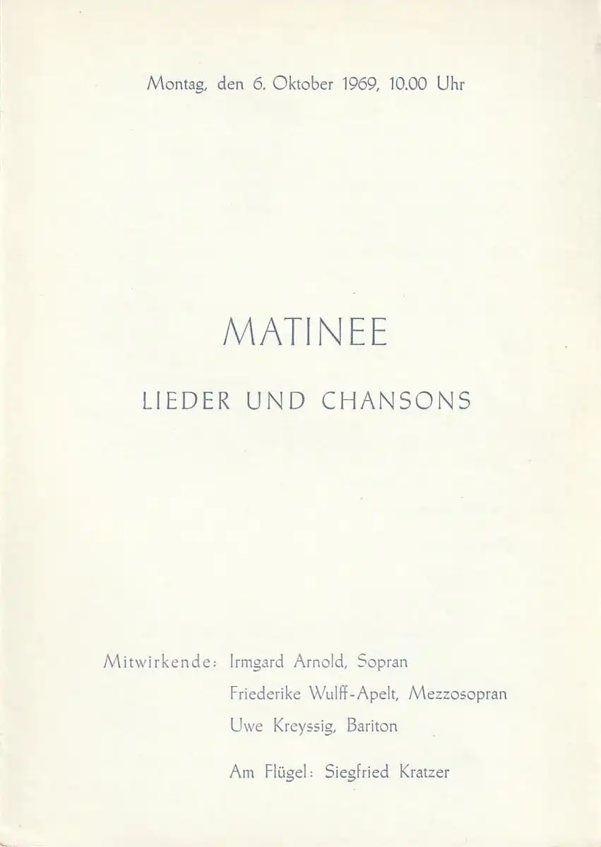 Komische Oper Berlin: Programmheft MATINEE LIEDER UND CHANSONS 6. Oktober 1969 Spielzeit 1969 / 70.
