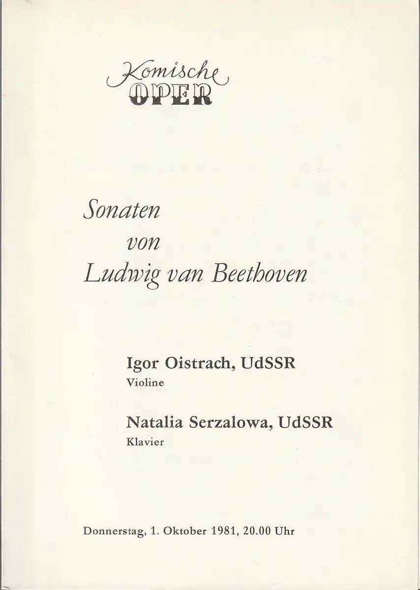Komische Oper Berlin: Programmheft SONATEN VON LUDWIG VAN BEETHOVEN 1. Oktober 1981.