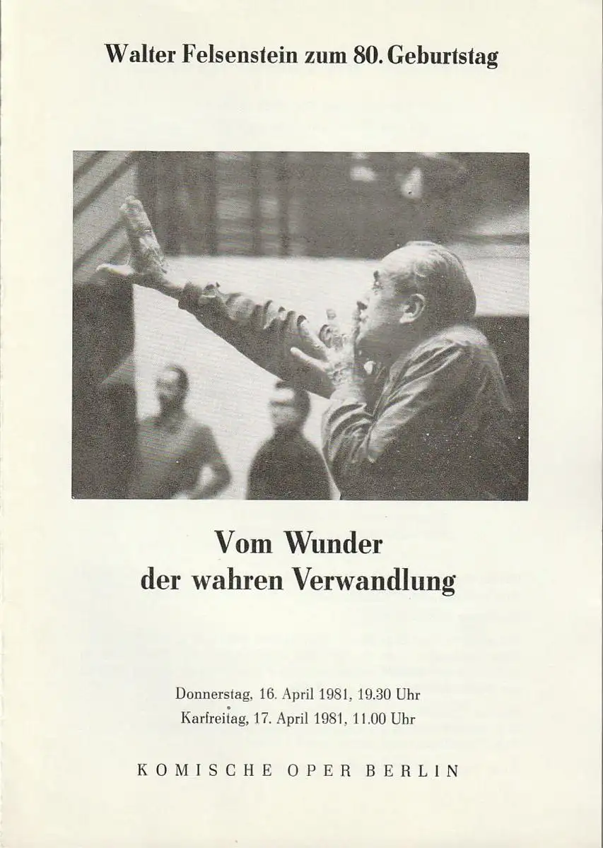 Vom Wunder der wahren Verwandlung. Bekenntnisse Walter Felsensteins und Ausschnitte aus seinen Inszenierungen. Ein Musiktheaterprogramm des Ensembles der Komischen Oper konzipiert und zusammengestellt von Johannes Felsenstein und Martin Vogler. Musikalische Leitung: Kurt Masur. Szenische Leitung: Johannes Felsenstein. Bühne: Reinhart Zimmermann. Kostüme: Eleonore Kleiber. Choreographie: Tom Schilling, Irmgard Kern. Regieassistenz: Sabine Wendenburg. Mitwirkende: Barbara Dollfus, Steffen Hackbarth, Jan-Peter Bündig, Irmgard Arnold,Günther Neumann, Friedrike Wulff-Apelt, Alfred Wroblewski, Werner Enders, Hans Nocker, Christa Noack, Vladimir Bauer, Hannelore Bey, Roland Gawlik, Galina Pissarenko, Emma Sarkissjan, Wjatscheslaw Ossipow, Rudolf Asmus, Ida Hemmerling, Herbert Rößler, Ruth Schob-Lipska, Manfred Hopp, u. a. Gezeigt werden Szenen aus: Die Zauberflöte, La Traviata, Hoffmanns Erzählungen, Othello, Romeo und Julia, Carmen, Das schlaue Füchslein und Ein Sommernachtstraum - Theaterprogramm, Opernprogramm, Ballettprogramm, Musicalprogramm, Konzertprogramm, Theatermemorabilia, Programmhefte Sammlung, deutsche Theatergeschichte.