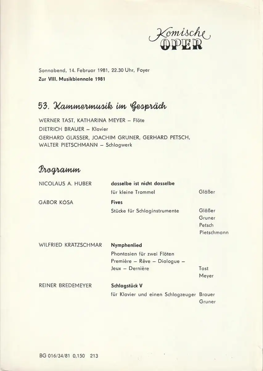 Titel: Theaterzettel 53. KAMMERMUSIK IM GESPRÄCH 14. Februar 1981 Foyer Komische Oper Spielzeit 1980 / 81 zur VIII. Musikbiennale 1981