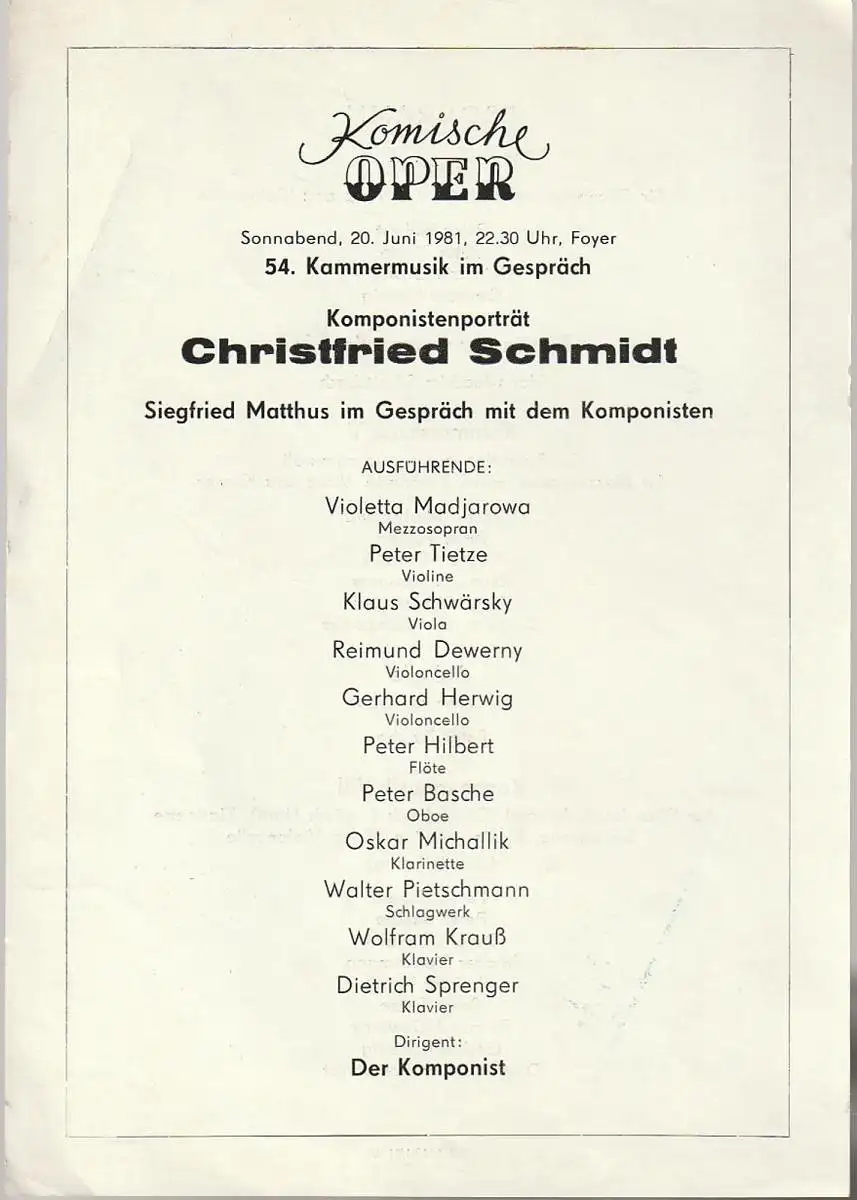Siegfried Matthus im Gespäch mit dem Komponisten. Ausführende: Bergit Sprenger, Violetta Madjarowa, Mezzosopran / Peter Tietze, Violine / Klaus Schwärsky, Violine / Reimund Dewerny, Gerhard Herwig, Violoncello / Peter Hilbert, Flöte / Peter Basche, Oboe /Manfred Michel, Oskar Michallik, Klarinette / Walter Pietschmann, Schlagwerk / Wolfram Krauß, Dietrich Sprenger, Klavier. Dirigent: Der Komponist. Programm: CHRISTFRIED SCHMIDT: Quartett für Flöteninstrumente, Violine, Viola und Violoncello. Partita per violoncello solo. Kammermusik V Configurationes pro arte camerali für Mezzosopran, Flöte, Klarinette, Viola und Klavier. Aulodie, Episoden für Oboe. Kammermusik VIII Uraufführung, für Flöte (auch Altflöte ), Oboe ( auch Englisch Horn ), Klarinette, Schalgzeug, Klavier, Violine,Viola, Violoncello. - Theaterprogramm, Opernprogramm, Ballettprogramm, Musicalprogramm, Konzertprogramm, Theatermemorabilia, Programmhefte Sammlung, deutsche Theatergeschichte.