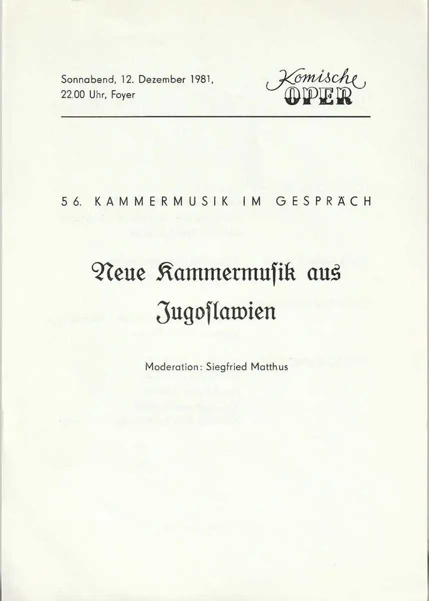 Komische Oper Berlin: Theaterzettel 56. KAMMERMUSIK IM GESPRÄCH NEUE KAMMERMUSIK AUS JUGOSLAWIEN 12. Dezember 1981 Foyer Komische Oper Spielzeit 1981 / 82.