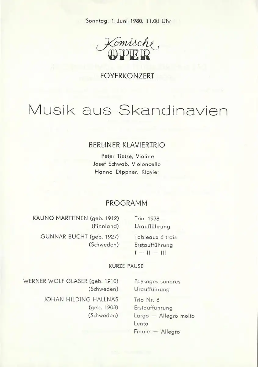 Berliner Klavier-Trio: Peter Tietze, Violine / Josef Schwab, Violoncello / Hanna Dippner, Klavier. Programm: KAUNO MARTTINEN: Uraufführung Trio 1978. GUNNAR BUCHT: Erstaufführung,Tableaux a trois. WERNER WOLF GLASER: Uraufführung: Paysages sonores. JOHANN HILDING HALLNÄS: Erstaufführung. Trio Nr. 6 - Theaterprogramm, Opernprogramm, Ballettprogramm, Musicalprogramm, Konzertprogramm, Theatermemorabilia, Programmhefte Sammlung, deutsche Theatergeschichte.