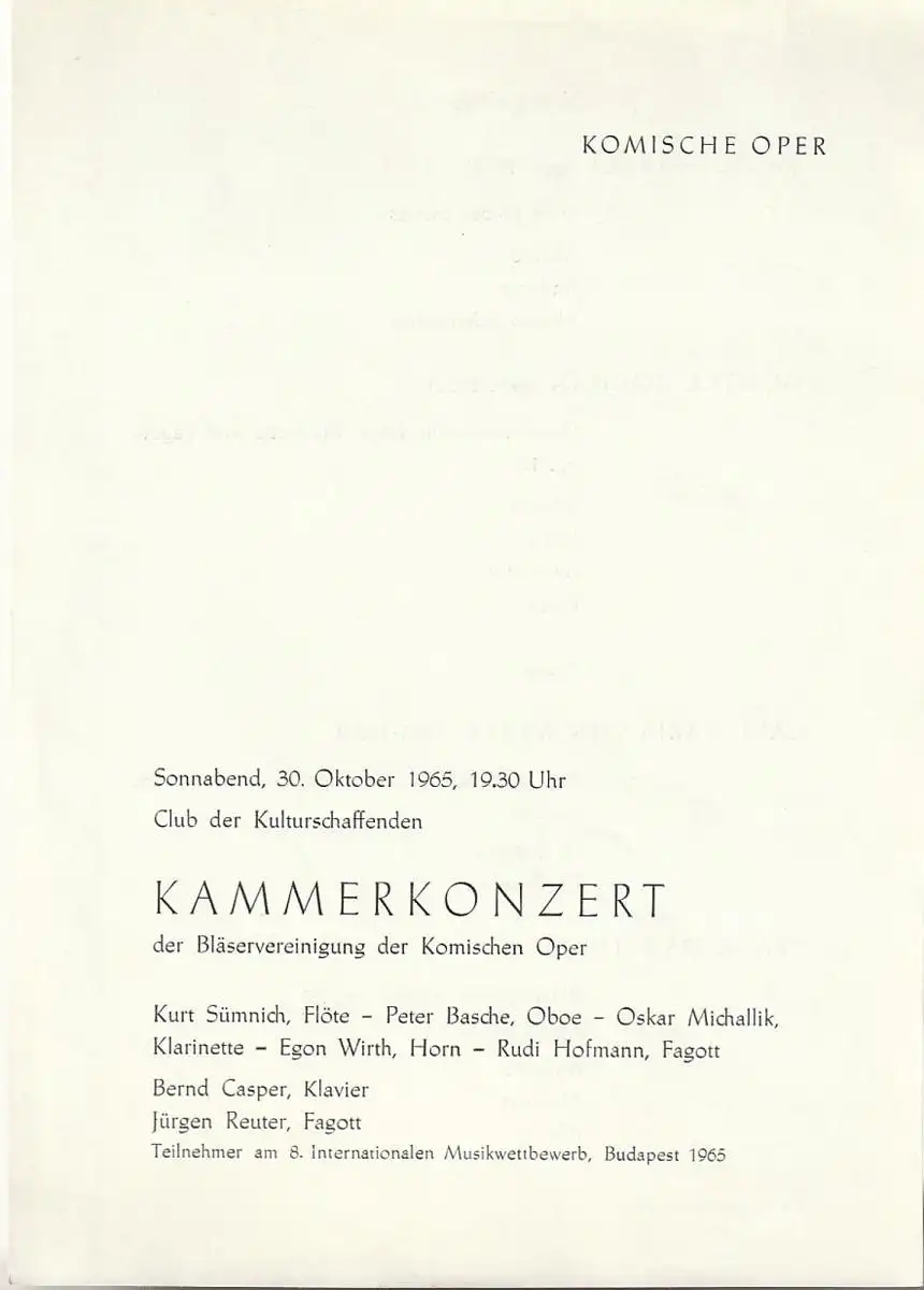 Komische Oper Berlin: Theaterzettel KAMMERKONZERT DER BLÄSERVEREINIGUNG DER KOMISCHEN OPER 30. Oktober 1965 Club der Kulturschaffenden Spielzeit 1965 / 66.