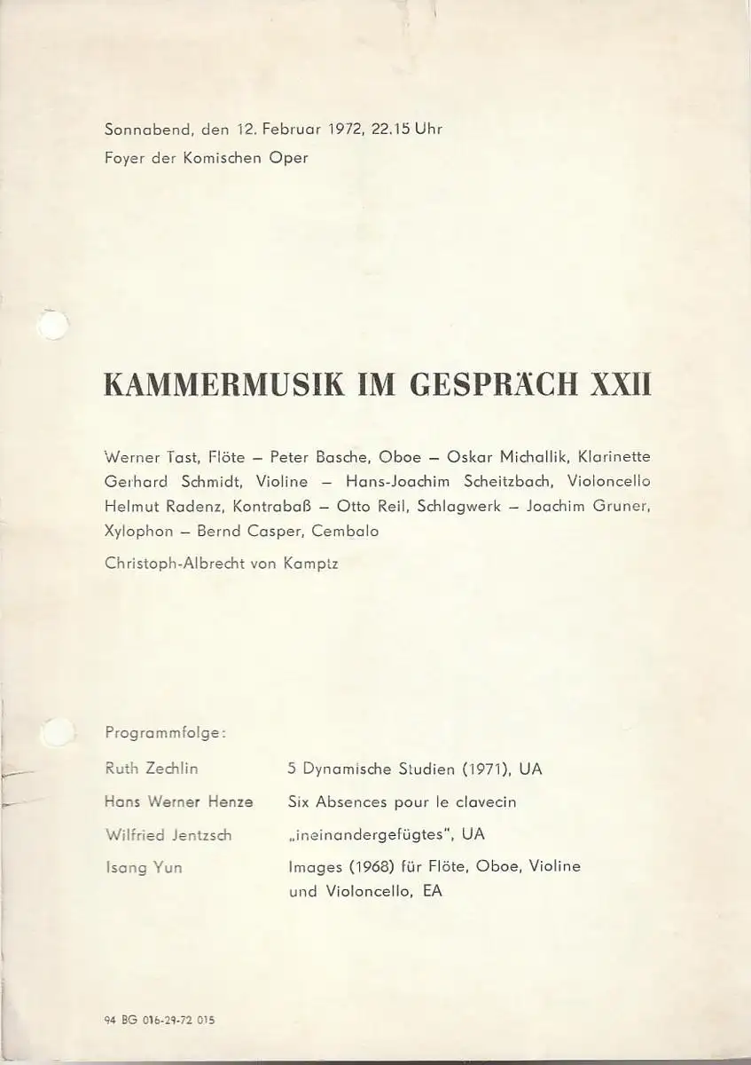Werner Tast, Flöte / Peter Basche, Oboe / Oskar Michalli, Klarinette / Gerhard Schmidt, Violine / hans-Joachim Scheitzbach, Violoncello / Helmut Radenz, Kontrabaß / Otto Reil, Schlagwerk, Joachim Gruner, Xylophon / Bernd Casper, Cembalo. Christoph-Albrecht von kamptz. Programm: RUTH ZECHLIN: 5 Dynamische Studien. HANS WERNER HENZE: Six Absences pour le clavecin. WILFRIED JENTZSCH: ineinandergfügtes. ISANG YUN: Images für Flöte, Oboe, Violine und Violoncello. - Theaterprogramm, Opernprogramm, Ballettprogramm, Musicalprogramm, Konzertprogramm, Theatermemorabilia, Programmhefte Sammlung, deutsche Theatergeschichte.