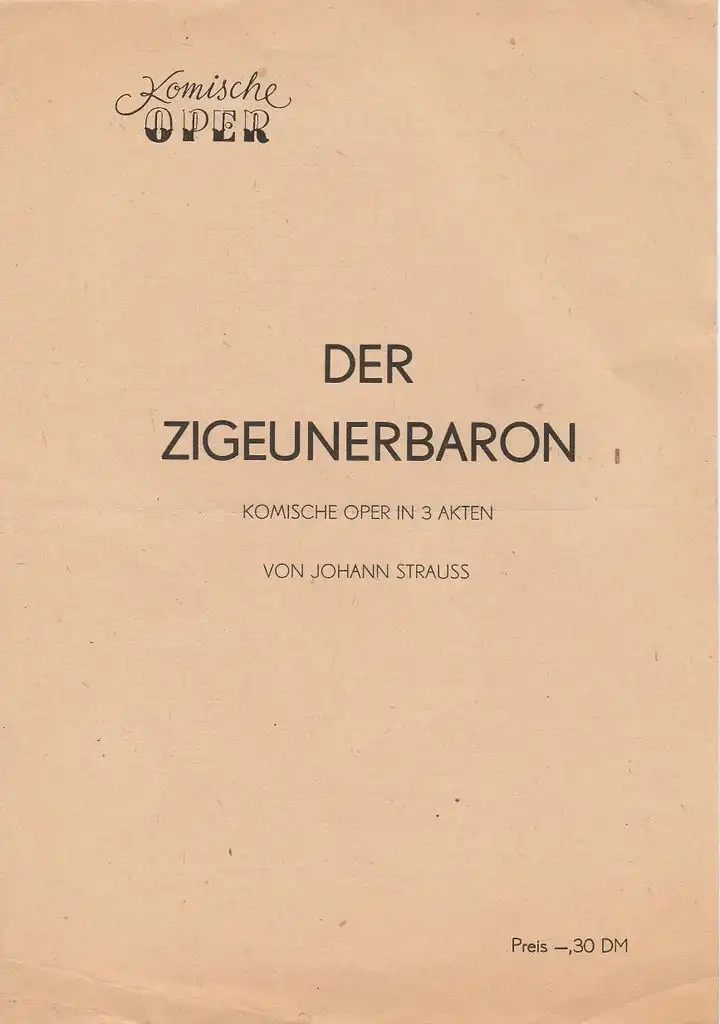 Komische Oper: Theaterzettel Johann Strauss DER ZIGERUNERBARON ca. 1949.