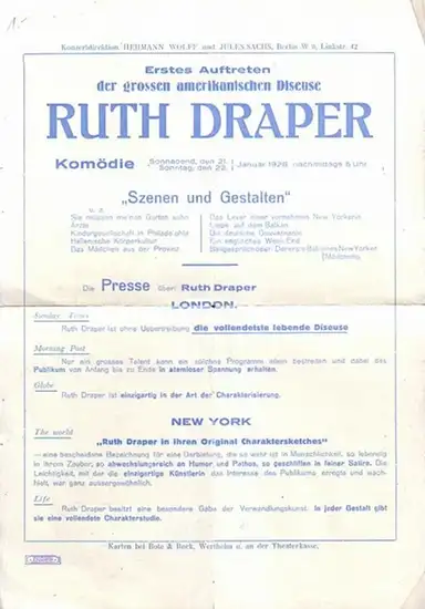 Komödie Berlin. - Draper, Ruth: Programmzettel: Erstes Auftreten der grossen amerikanischen Diseuse Ruth Draper in der Komödie, Berlin am 21. und 22. Januar 1928. Konzertdirektion Hermann Wolff und Jules Sachs, Berlin.