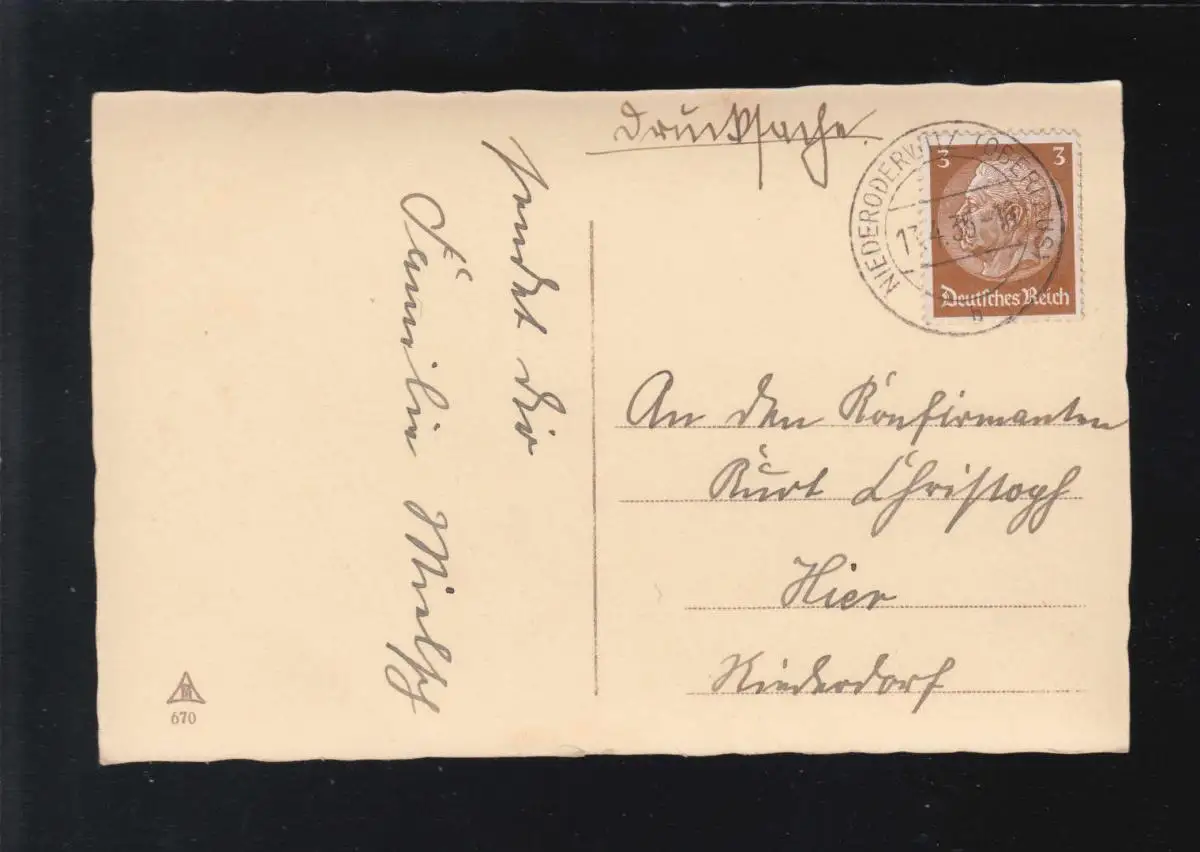 Konfirmation Glückwunsch Junge neben Tisch mit Blumen, Niederoderwitz 13.4.1935