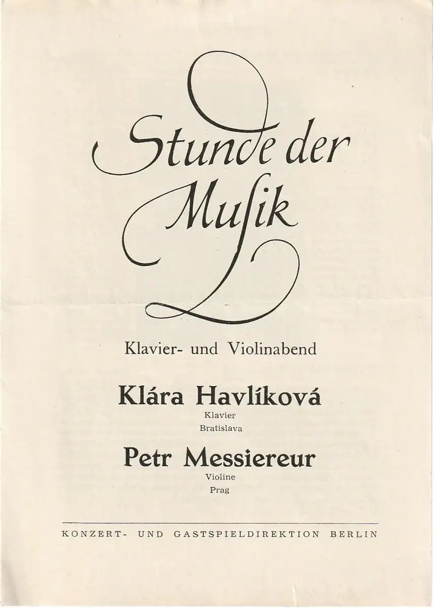Konzert- und Gastspieldirektion Berlin: Programmheft STUNDE DER MUSIK KLAVIER- UND VIOLINABEND KLARA HAVLIKOVA / PETR MESSIEREUR Spielzeit 1964.