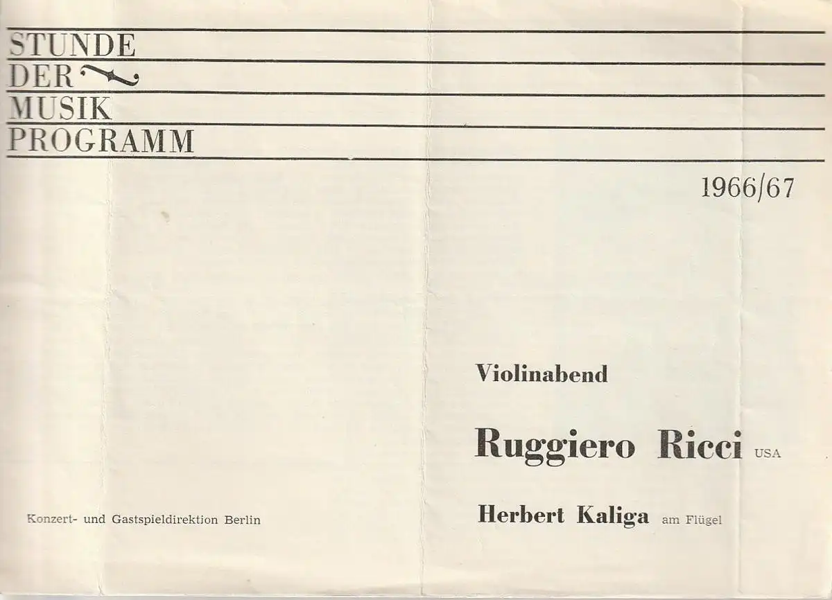 Konzert- und Gastspieldriektion Berlin: Programmheft STUNDE DER MUSIK 1966 / 1967 VIOLINABEND RUGGIERO RICCI / HERBERT KALIGA.