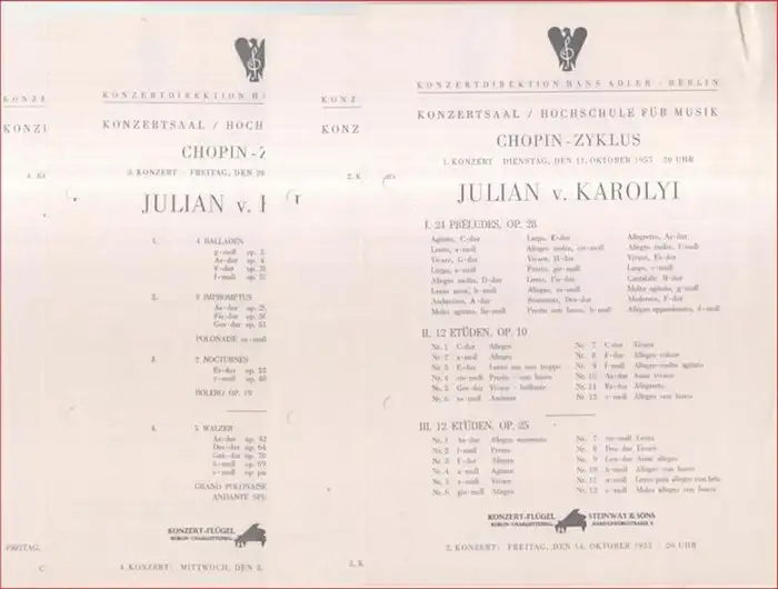 Konzertdirektion Hans Adler, Berlin. - Julian v. Karolyi: Programmzettel zum 1. - 4. Konzert: Chopin-Zyklus, gespielt von Julian v. Karolyi im Konzertsaal der Hochschule für Musik, am 11., 14. und 28. Oktober sowie 2. November 1955.