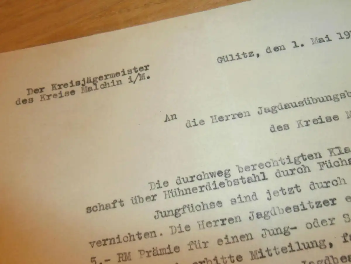 Kreisjägermeister Mecklenburg , Gülitz b. Malchin 1937 , Jagd , Fuchsjagd , Jäger , Diebstahl , Hühner ,altes Dokument !