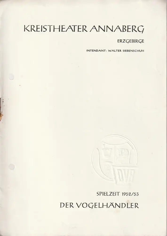 Kreistheater Annaberg Erzgebirge, Walter Siebenschuh, Waldo Schubert, Kurt Werner Knoll: Programmheft Carl Zeller DER VOGELHÄNDLER Spielzeit 1952 / 53.