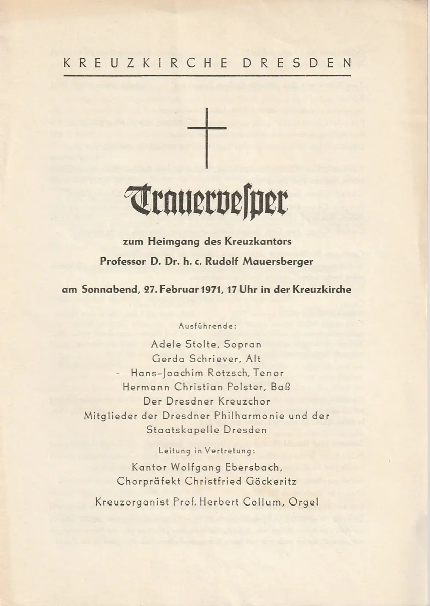 Kreuzkirche Dresden: Programmheft TRAUERVESPER zum Heimgang des KREUTZKANTORS RUDOLF MAUERSBERGER 27. Februar 1971 Kreuzkirche.