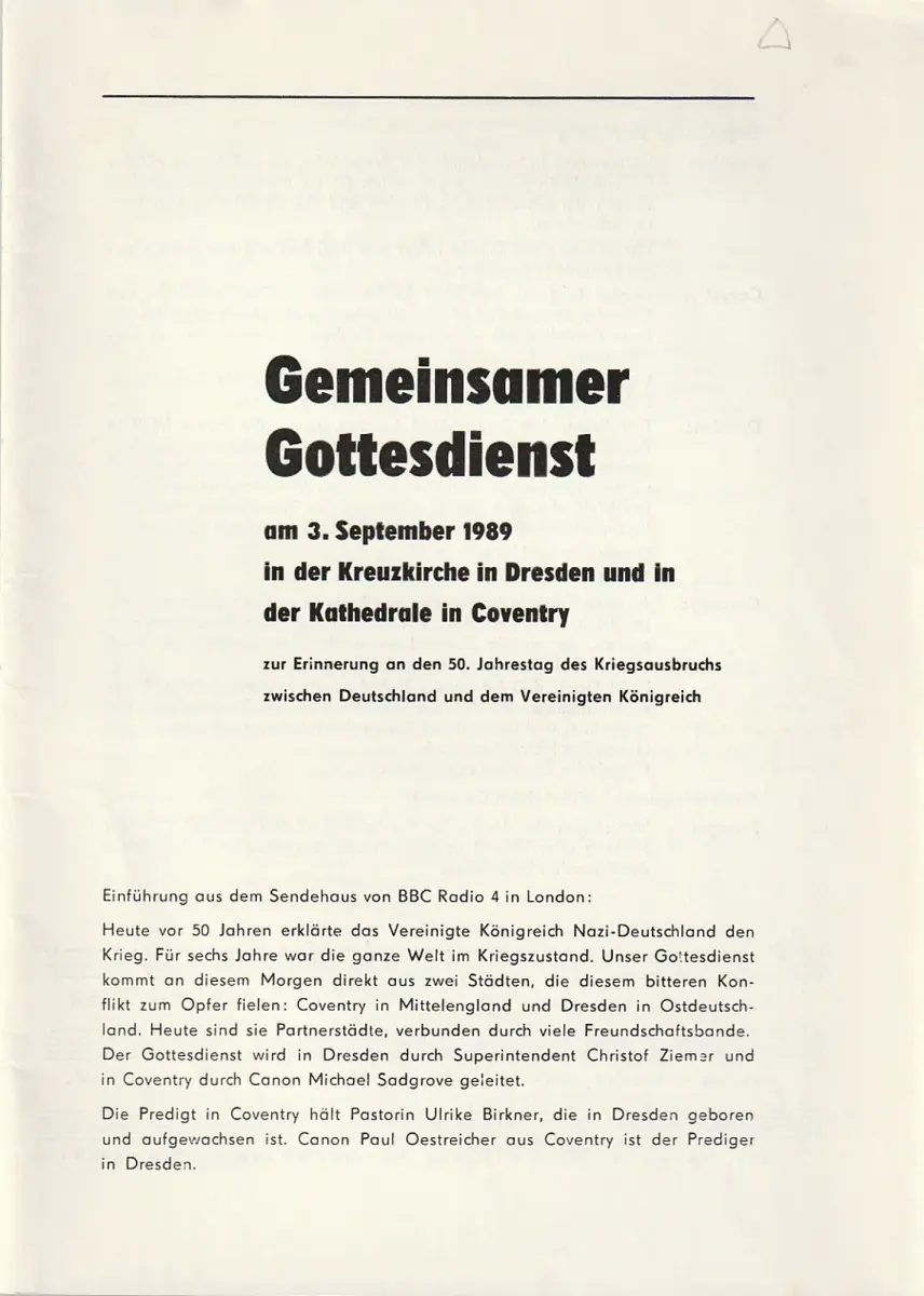 Kreuzkirche in Dresden, Kathedrale in Coventry: Programmheft GEMEINSAMER GOTTESDIENST AM 3. September 1989.