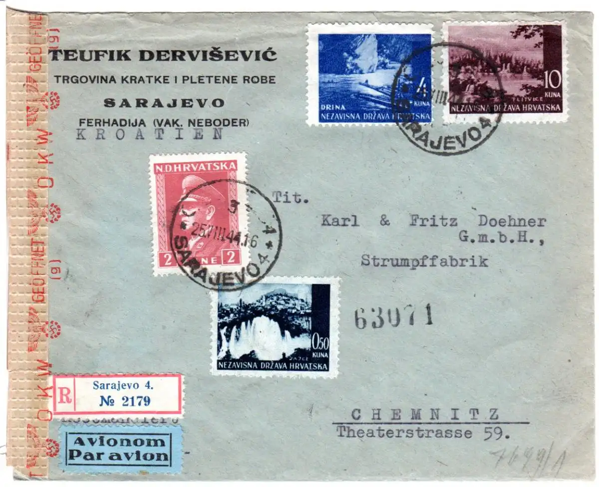 Kroatien 1944, 4 Marken auf Luftpost Einschreiben Zensur Brief v. Sarajevo