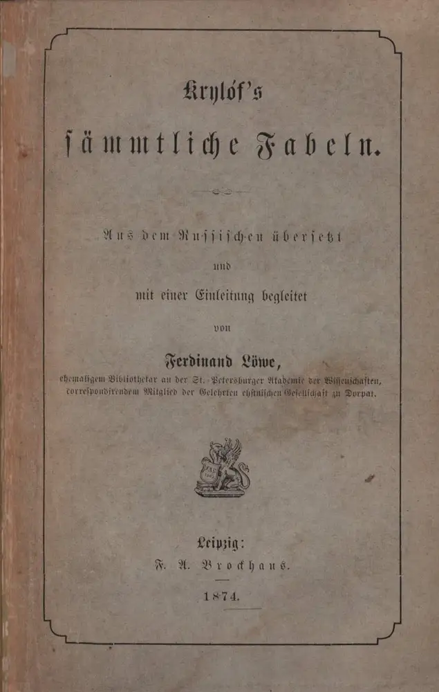 Titel: Krylóf's sämmtliche Fabeln. Aus dem Russischen übersetzt und mit einer Einleitung begleitet von Ferdinand Löwe
