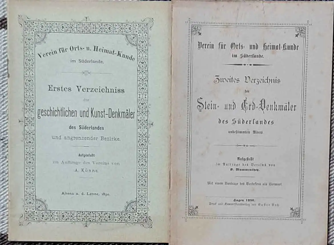 Künne, A. und K. Mummenthey: Erstes Verzeichniss der geschichtlichen und Kunst-Denkmäler des Süderlandes und angrenzender Bezirke. / Zweites Verzeichnis der Stein- und Erd-Denkmäler des Süderlandes unbestimmten Alters.