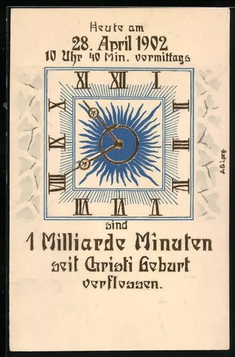 Künstler-AK 1 Millarde Minuten seit der Geburt Christi vergangen, 28. April 1902 um 10 Uhr 40