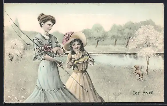 Künstler-AK 1er Avril, Mutter und Tochter mit Angel und Fisch