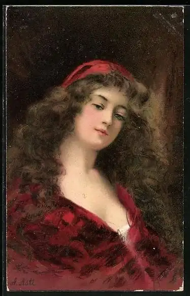 Künstler-AK A. Asti: Mädchen mit roter Kopfbedeckung, roter Umhang