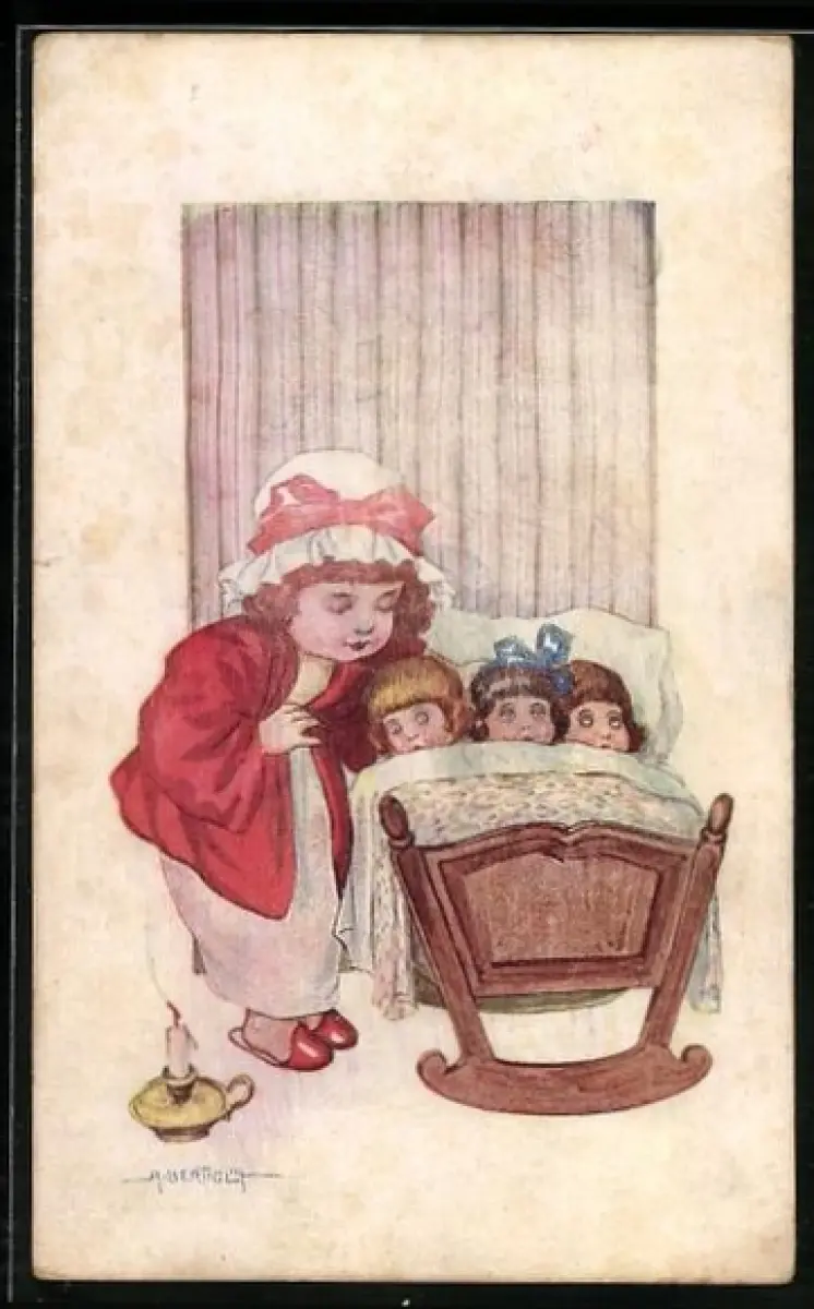 Künstler-AK A. Bertiglia: Junges Mädchen spielt Mutter und bringt ihre Puppen zu Bett