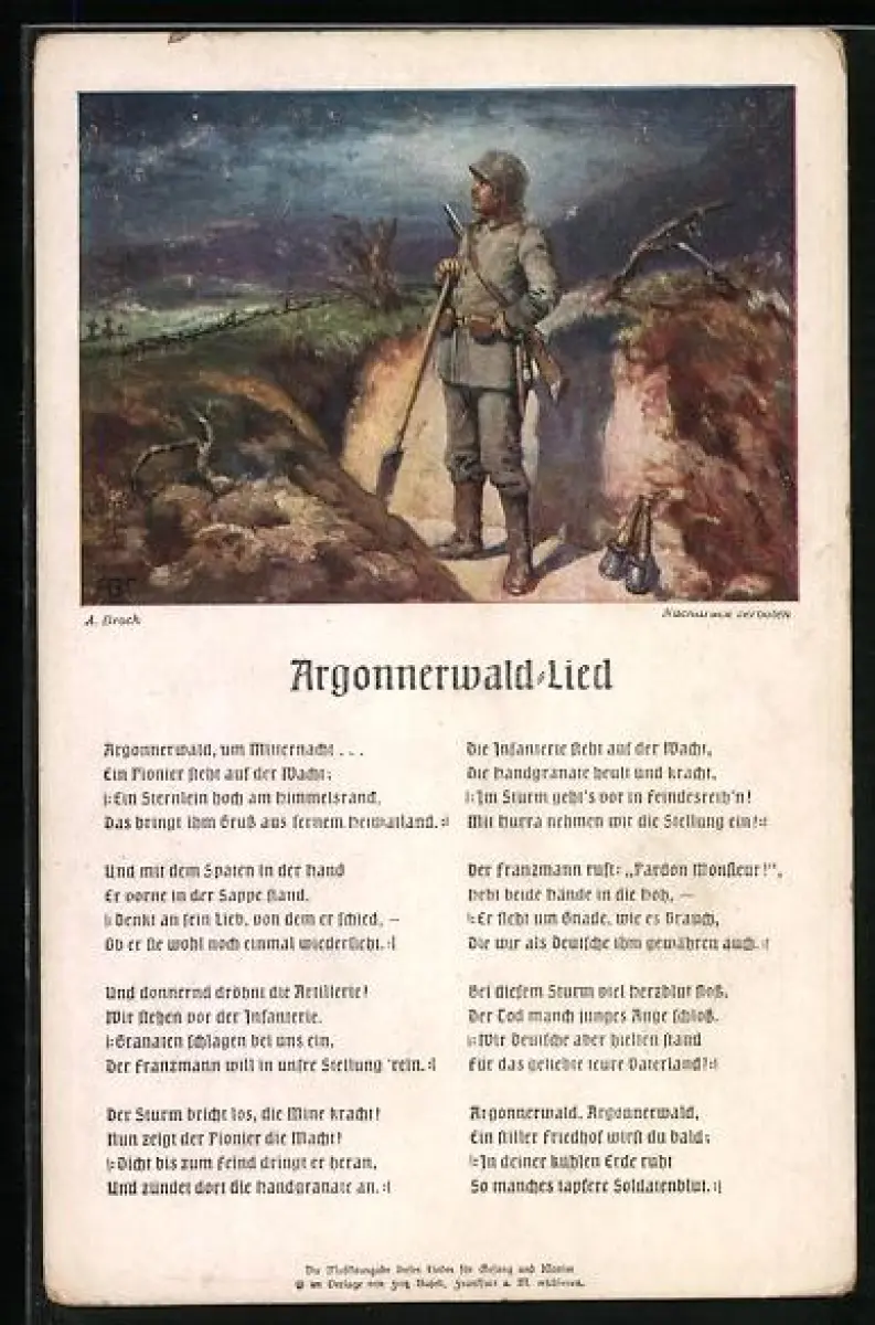Künstler-AK A. Broch: Soldat mit Stiel-Handgranaten, Argonnerwald-Lied