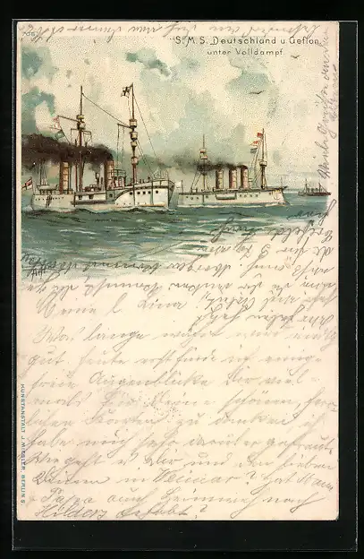 Künstler-AK A. Heide: Kriegsschiffe SMS Deutschland und Gefion des Ostasiengeschwaders