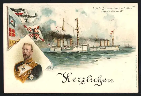 Künstler-AK A. Heide: Kriegsschiffe SMS Deutschland und Gefion des Ostasiengeschwaders unter Volldampf