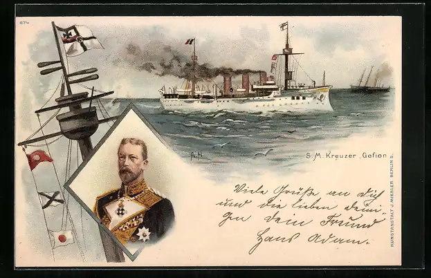 Künstler-AK A. Heide: SM Kreuzer Gefion des Ostasiengeschwaders in Chinas Gewässern