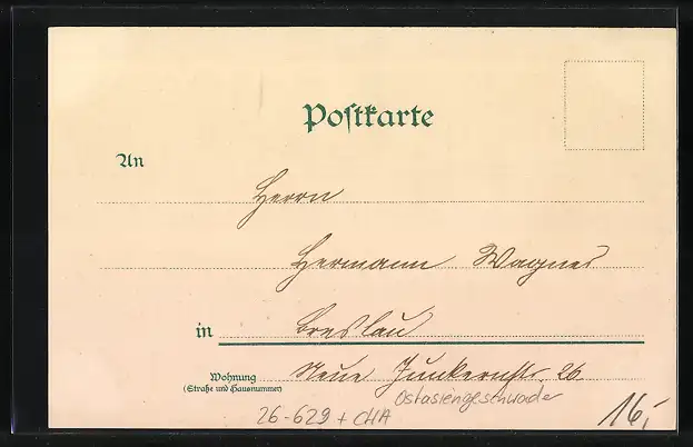 Personenbezogene Daten auf der Rückseite der Karte wurden durch blauen Textmarker unkenntlich gemacht. Die blauen Stellen sind auf die Vorderseite durchgeweicht und wirken sich negativ auf das Postkartenfoto aus