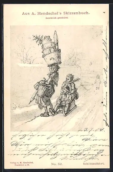 Künstler-AK A. Hendschel: Schlittenfahrt, Kinder bei der Abfahrt fahren beinahe eine Frau an
