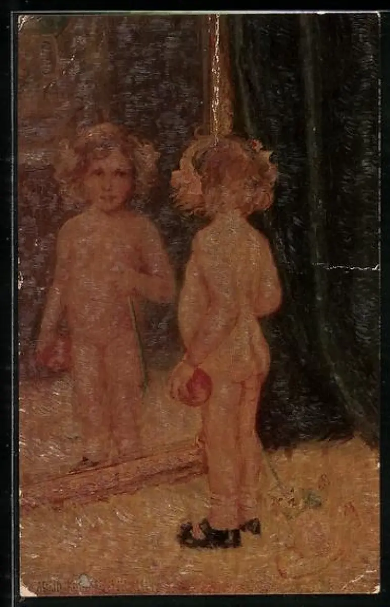 Künstler-AK A. Kjellberg-Juel: Die moderne Eva, Nacktes Kind mit Teddy vor Spiegel