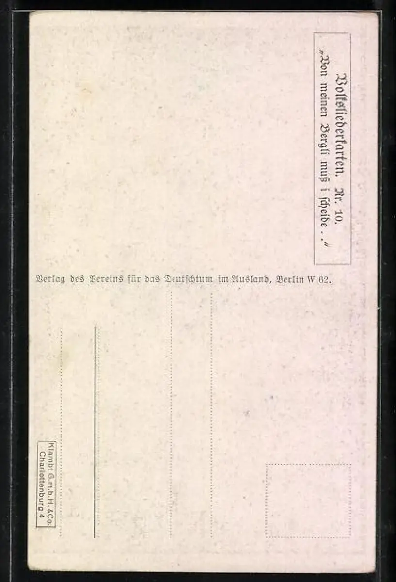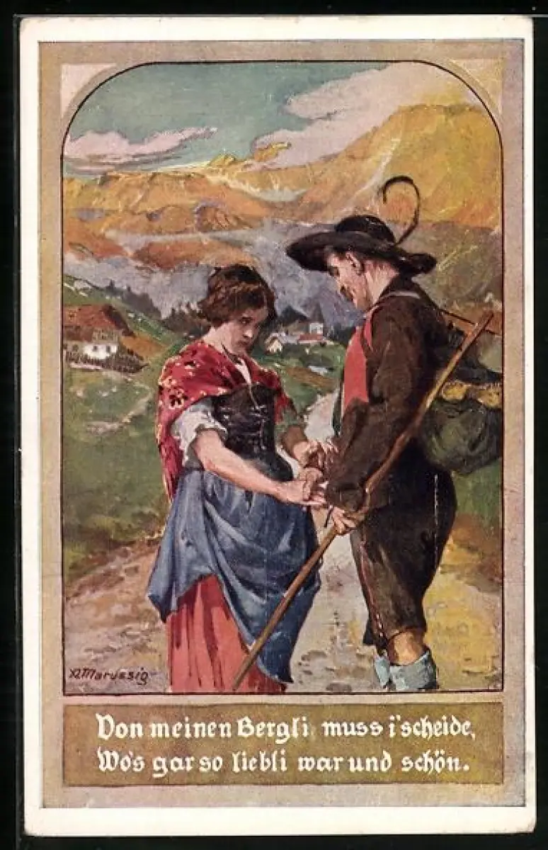 Künstler-AK A. Marussig: Mann verabschiedet sich von seiner Geliebten, vom Bergli muss i` scheide