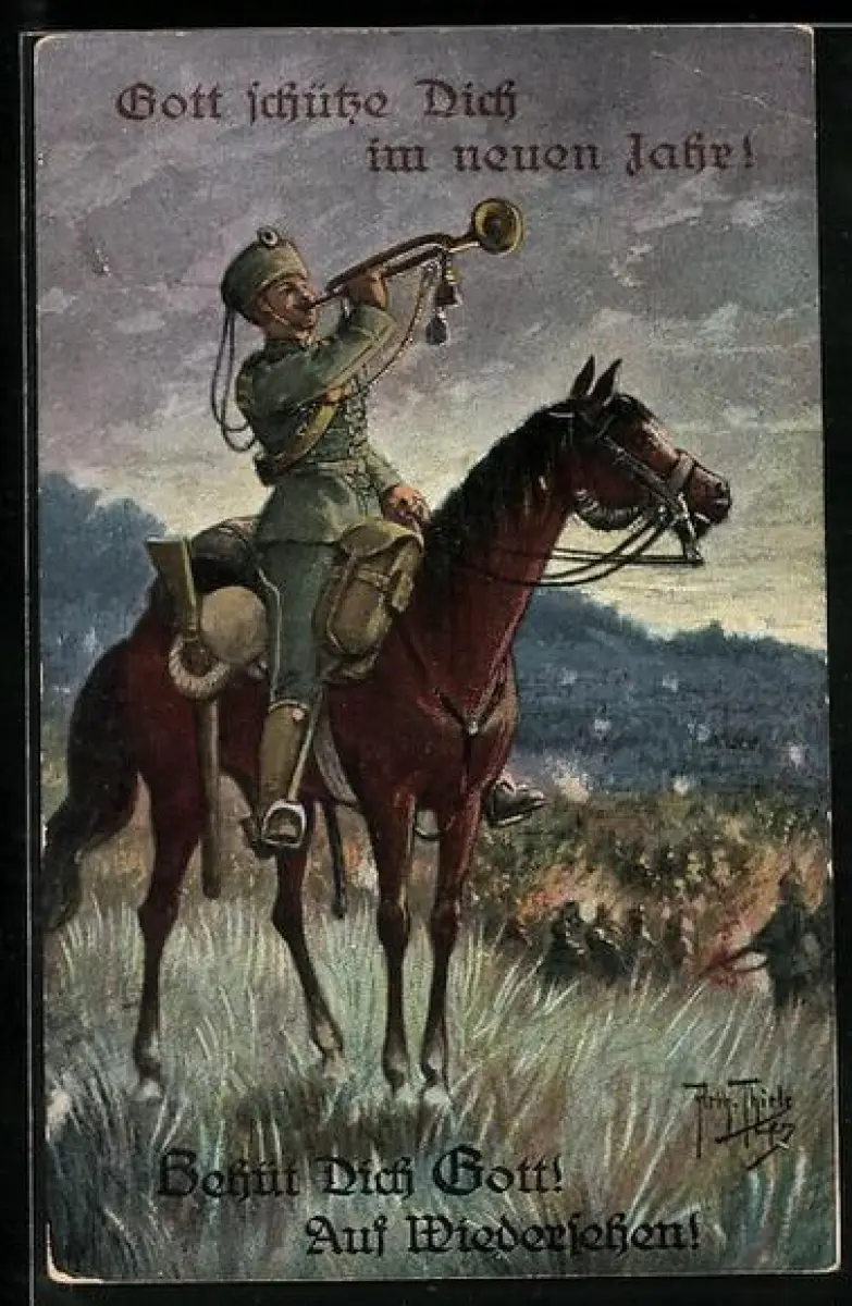 Künstler-AK A. Thiele: Reiter spielt sein Morgenlied, Behüt dich Gott, auf Wiedersehen