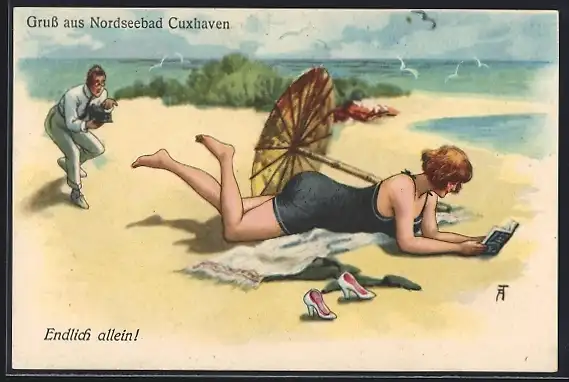 Künstler-AK A. Thiele: Voyeur mit einem Fotoapparat beobachtet Dame am Strand