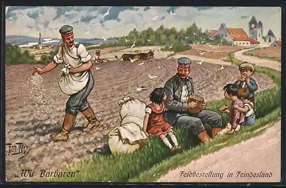 Künstler-AK A. Thiele: Wir Barbaren, Feldbestellung im Feindesland, Soldat teilt mit Kindern Brot