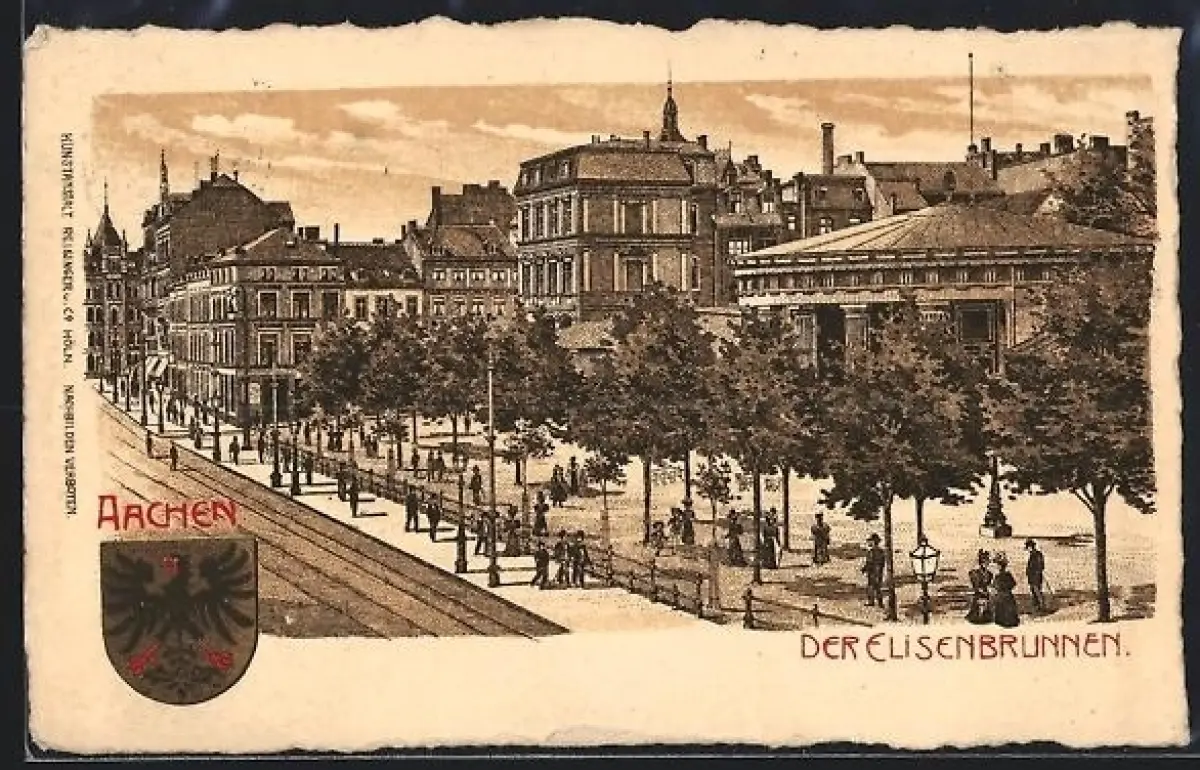 Künstler-AK Aachen, Elisenbrunnen mit Wappen