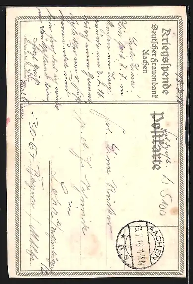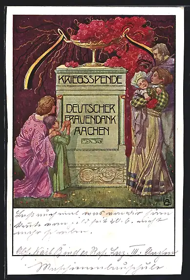 Künstler-AK Aachen, Kriegsspende Deutscher Frauendank, Darbringung von Spenden