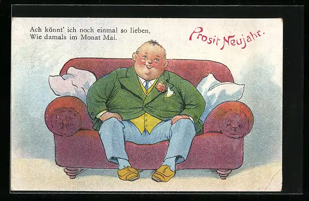 Künstler-AK Ach, könnt ich noch einmal so lieben, Dicker Mann sitzt auf einem Sofa, Neujahrsgruss