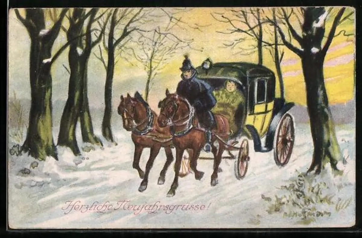 Künstler-AK Ad. Hoffmann: Eine Kutsche fährt über eine verschneite Strasse