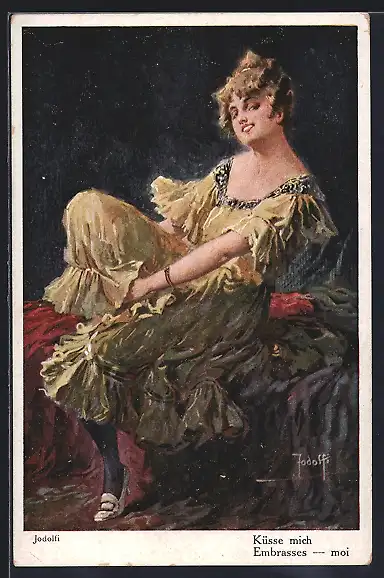 Künstler-AK Adolf (Jodolfi): Küsse mich Frau mit verführerischem Lächeln auf dem Bett