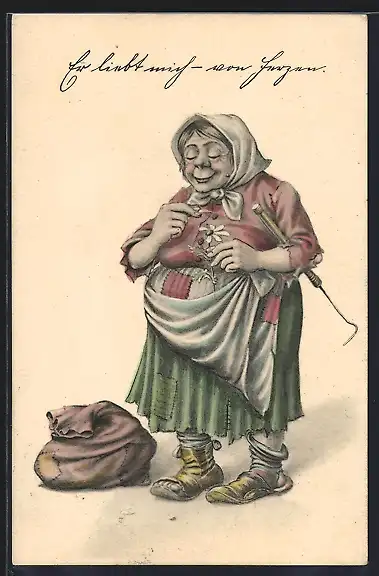 Künstler-AK Ältere Frau in zerschlissener Kleidung sucht nach Liebe