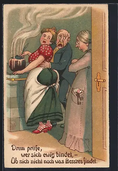 Künstler-AK Älterer Herr macht sich an des Dienstmädchen ran, seine Frau erwischt ihn